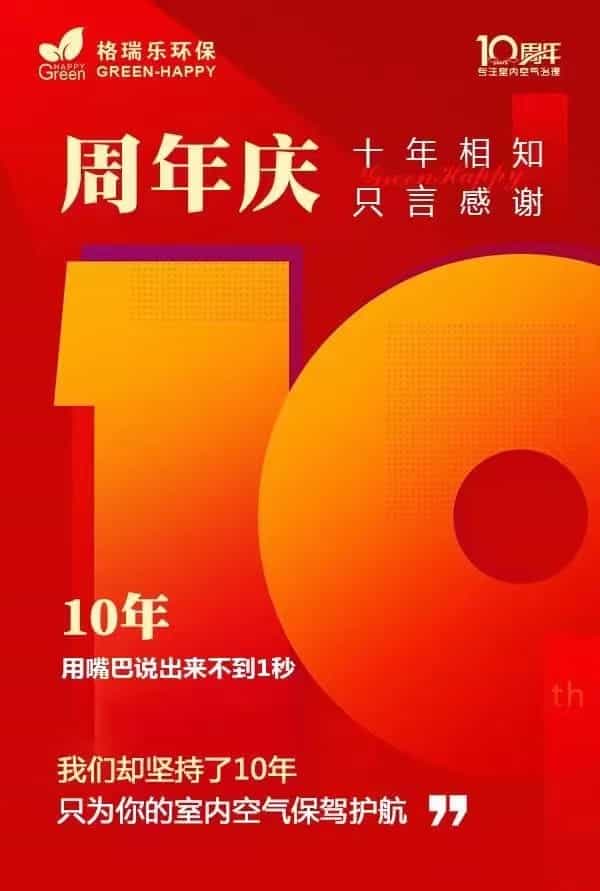 在庆祝格瑞乐环保成立十周年的同时,公司也对未来充满了期待。将会继续投入更多的资源,发展更先进的技术,以应对日益严重的环境问题。将以更高的标准,更严的要求,创造更美好的室内空气环境,为构建绿色、和谐的社会贡献自己的力量。